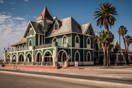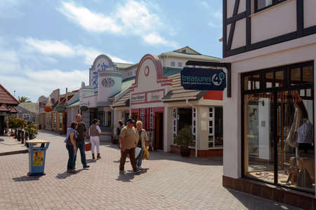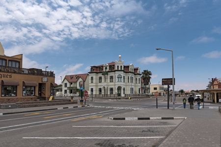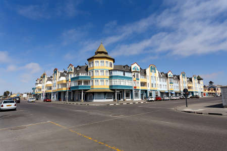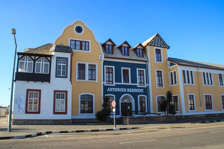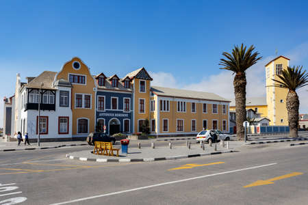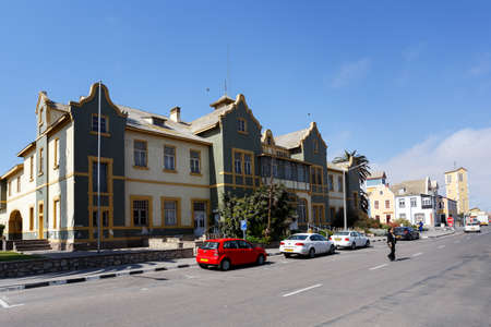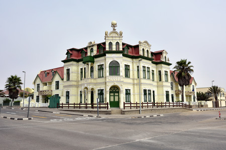 SWAKOPMUND, NAMIBIA - October 8, 2014: Beautiful colonial German architecture on stret of Swakopmund. City was founded in 1892, by Captain Curt von Francois as the main harbour of German South West Africa.