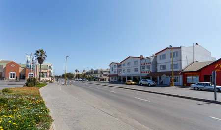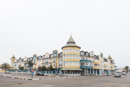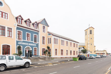 SWAKOPMUND, NAMIBIA - JUNE 30, 2017: A street scene, with apartments and businesses in Swakopmund, in the Namib Desert on the Atlantic Coast of Namibia