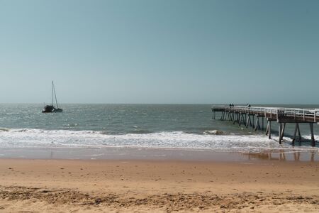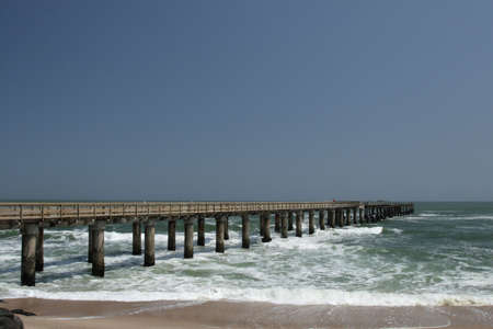 Pier on the Atlantic Ocean in Swakompund, Namibia. Beautiful sunset with a bright sky and soft gentle water and sand