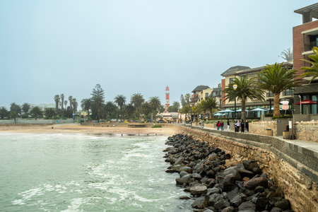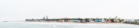 SWAKOPMUND, NAMIBIA - JUNE 30, 2017: Panorama of the Molen, the Strand Hotel and other buildings in Swakopmund as seen from the historic jetty