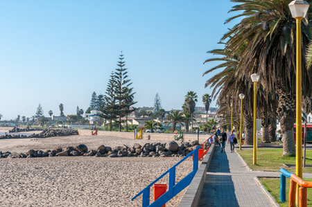 SWAKOPMUND, NAMIBIA - JUNE 18, 2012: A beach scene at the waterfront in Swakopmund. Palm trees and people are visible