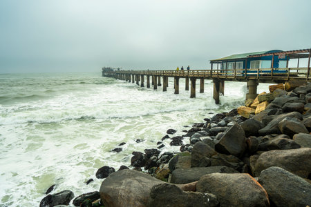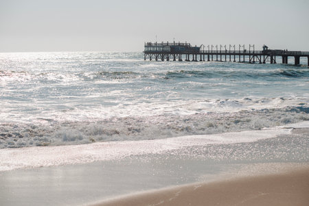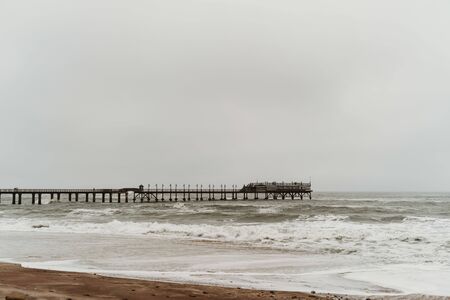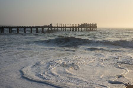 huge Swakopmund pier in stormy Atlantic ocean waters by evening