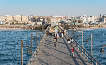 Long pier, walking people, residential houses on coastline of Swakopmund German colonial town, Namibia