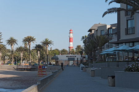Swakopmund, Namibia - 07 18 2013 Light house in the city center at sunset