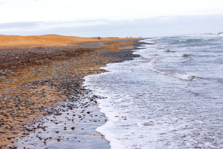 Beautiful pink sand on the shores of the Atlantic Ocean, waves and stones on a sunny bright day. Swakompund, Namibia.