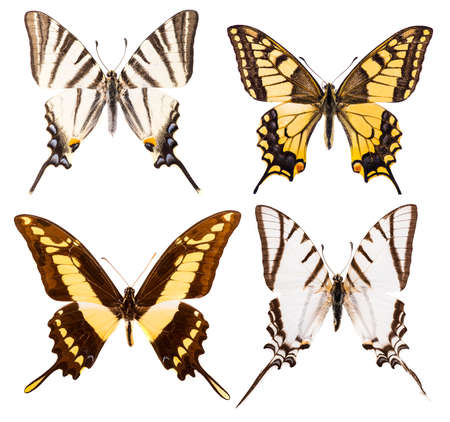 Set of four swallowtail butterflies - Iphiclides podalirius, Protesilaus protesilaus, Papilio machaon and Papilio thoas isolated on a white background
