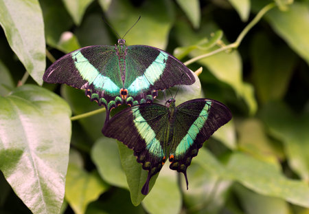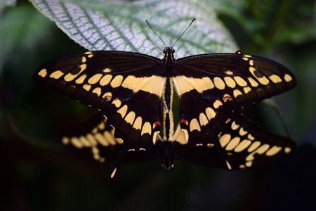 Closeup of a giant swallowtail sitting and glowing with a partner on a leaf in tropical nature