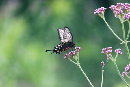 Incredibly beautiful day tropical butterfly Papilio maackii pollinates flowers. Black-white butterfly drinks nectar from flowers. Colors and beauty of nature.