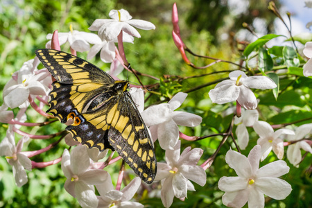 Anise Swallowtail butterfly resting on Jasmine flowers, California