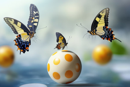 Three butterflies gracefully hover over a white ball adorned with orange dots in a tranquil setting.