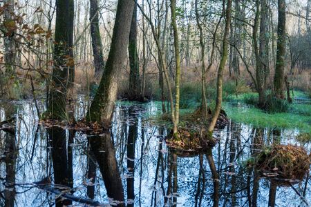 Natural alder-carr stand of Bialowieza Forest with standing water and Common Duckweed on surface among