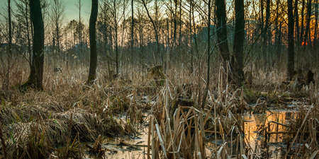 Swamp in the forest in sunset. lying tree branches on the banks of the river. Bialowieza Poland.