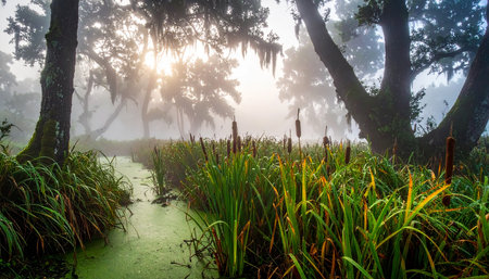 Mysterious swamp with murky water and dense vegetation surrounded by humid atmosphere