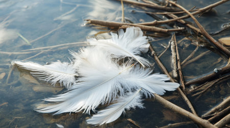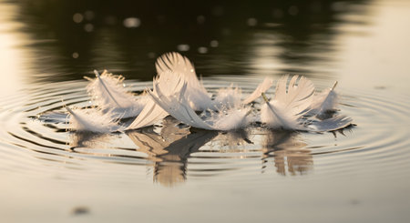 A serene composition of delicate white feathers peacefully floating on a still water surface, surrounded by natural debris, creating a tranquil scene.