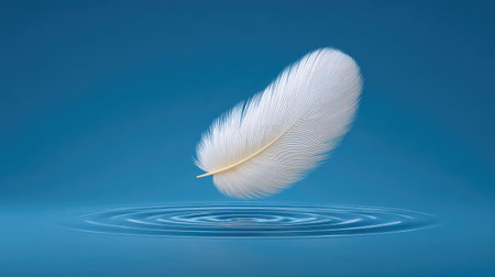 A delicate white feather gently floats above serene water ripples, creating a stunning visual of tranquility and elegance against a calming blue backdrop.