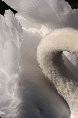 A close-up of a swans delicate feathers glistening in the sunlight as it paddles across the water.