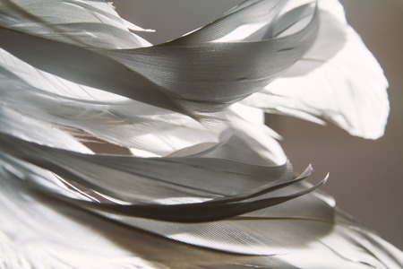 Macro close up of soft white feather texture with gentle shadows on neutral background, minimal calm and purity concept, natural light