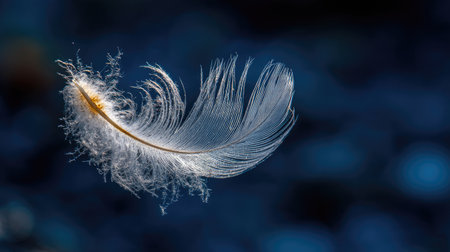 A delicate white feather is captured in a close-up shot, exhibiting intricate textures and details. The feather displays a gentle curve with a golden stem. Set against a blurred dark blue background, the image evokes a sense of tranquility. Suitable for design projects and commercial applications, the image can be used for various purposes.