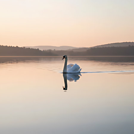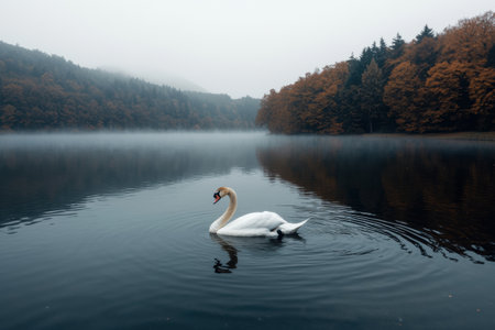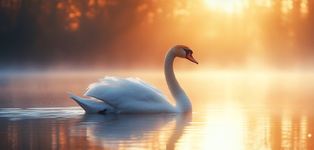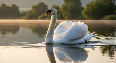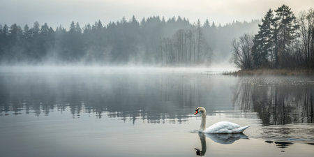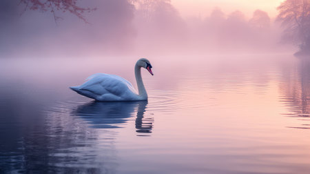 A beautiful white swan gracefully glides through the misty waters at dawn, creating soft reflections. The serene atmosphere captures the essence of nature