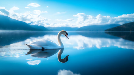 Featuring a photo of a white swan with its reflection on a blue background, symbolizing purity and elegance. taken with natural lighting, this high resolution photograph shows insanely detailed fine details of the isolated plain. the stock photo features color grading for a hyper realistic, cinemati