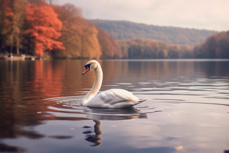 Generative AI Image of Beautiful Majestic White Swan at Fall Autumn Nature Lake River Wallpaper