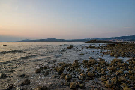 Beautiful calm sea water on a cold winters day. Giant stones are placed as sea defence infrastructure due to rising sea levels and global warming. Pebble beach with mountain backdrop.