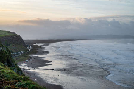 Cars parked on sand and rough seas at Downhill beach in Norhern Ireland