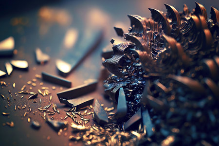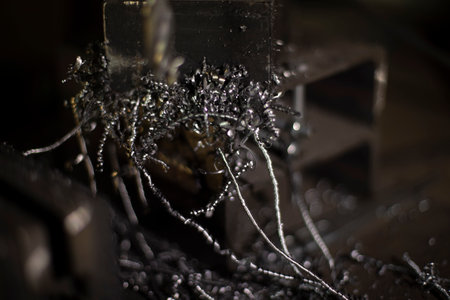 A dynamic close-up image of shiny metal shavings flying off a pile, showcasing the intricate details and textures found in a workshop environment.