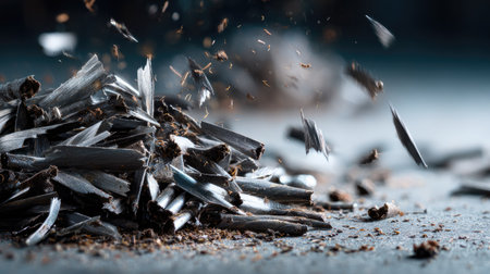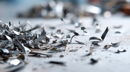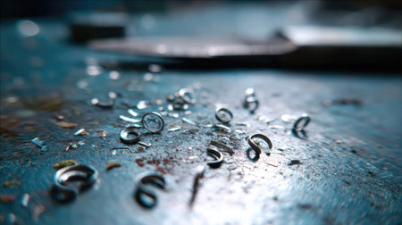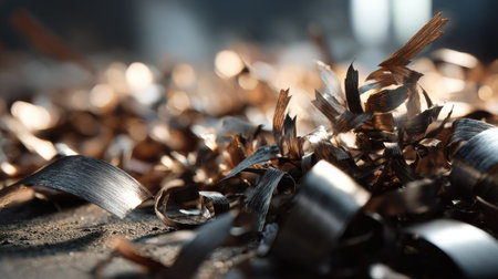 A captivating close-up image of shiny metal shavings scattered on a dark surface, showcasing intricate details of industrial material waste and craftsmanship.