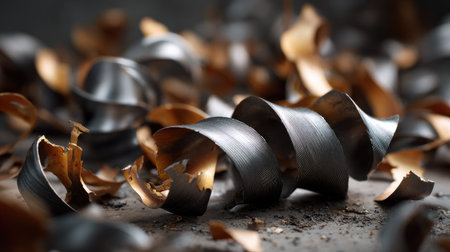 Discover the intricate beauty of metal shavings scattered on a dark surface. This close-up image captures the delicate spirals and curls created during the cutting process, emphasizing both artistry and industry.