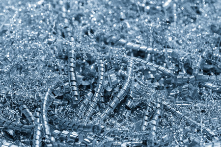 Close-up image showing detailed metal shavings in an industrial setting creating an intricate texture and pattern with a blurred background