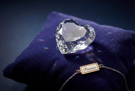 A clear heart shaped crystal gemstone rests on a dark blue velvet pillow beside a delicate bracelet featuring a rectangular plate with the word precious engraved in elegant cursive script.