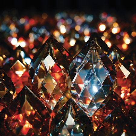 A stunning close-up of shimmering crystal pieces displaying vibrant colors and reflections. Perfect for design projects, luxury brochures, and abstract art.