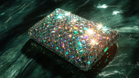 This stunning photo features a sparkling clutch bag adorned with colorful gems, sitting elegantly on a dark marble surface. The vibrant reflections enhance the luxurious feel.