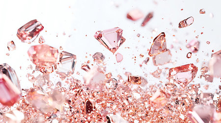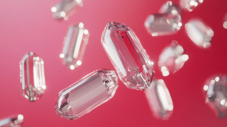 A captivating image of transparent crystals floating gracefully against a vibrant pink background, showcasing their intricate details and shimmering brilliance.