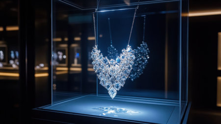 A captivating heart-shaped diamond necklace gleams magnificently under soft lighting in an elegant glass showcase, exuding luxury and craftsmanship.