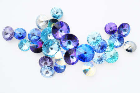 Brilliant crystal rhinestones on the sparkling blue holiday background. Flat lay, hard shade from the sun