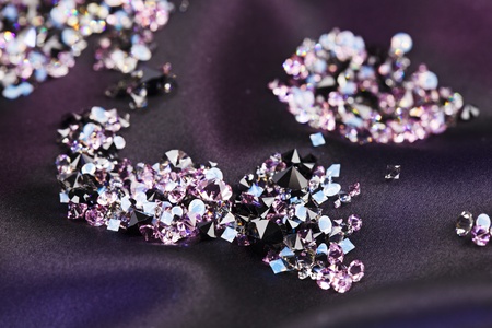 Diamond (small purple jewel) stones heap over black silk cloth background