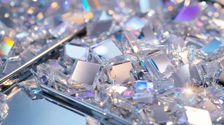 A close-up view of a shattered glass surface featuring sparkling reflections and highlights, creating an artistic and elegant appearance ideal for modern designs.