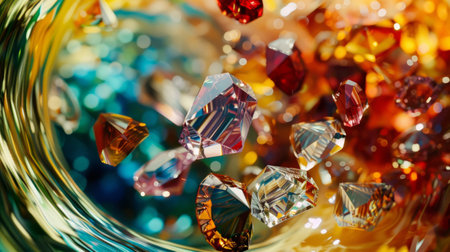 A stunning display of uniquely cut gemstones showcasing an array of colors and intricate reflections, creating an eye-catching and luxurious visual appeal suitable for various design projects.