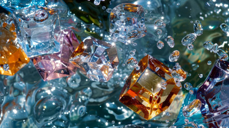 A mesmerizing arrangement of colorful gems glistens in calm water, showcasing their brilliance and enchanting reflections. Ideal for luxury and beauty themes.