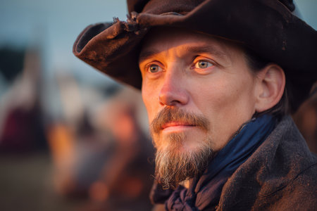 Bearded man wearing brown cowboy hat and blue scarf, gazing thoughtfully, with blurred background indicating an outdoor setting. Light casts a warm glow on his face