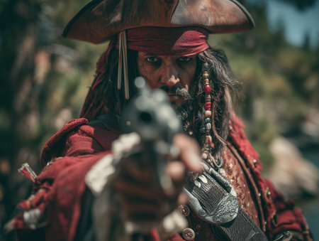 Pirate captain looking sternly, portraying a strong and determined leader from the golden age of piracy