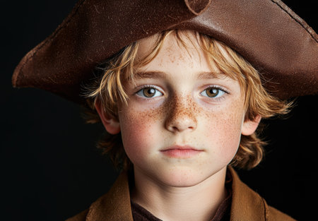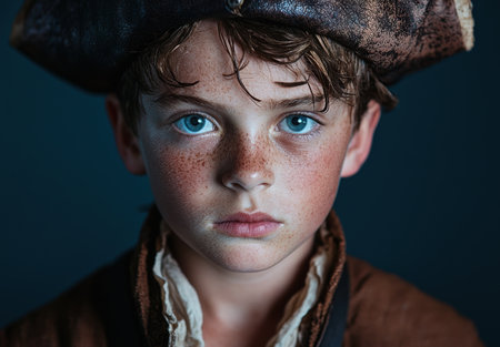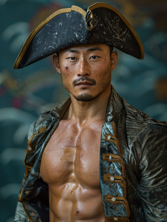 Portrait of a tough looking pirate wearing an eye patch and tricorn hat, posing against a dark background, conveying a sense of adventure and danger