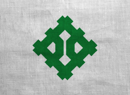 Official flag of Fukui. City in Japan. Conceptual collage on fabric texture