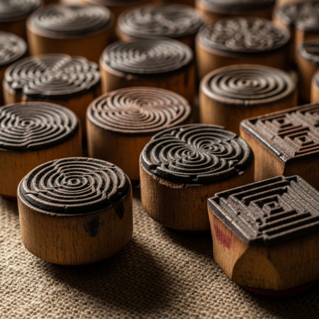 An editorial, low-angle photograph capturing a detailed collection of vintage, hand-carved wooden bl