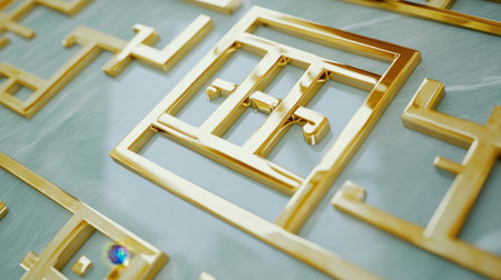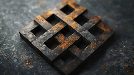 3d illustration of abstract geometric shapes on black background with golden elements.