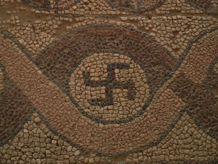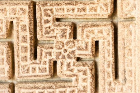 ancient ruins of stone carving depicting holy swastika mark at indoor