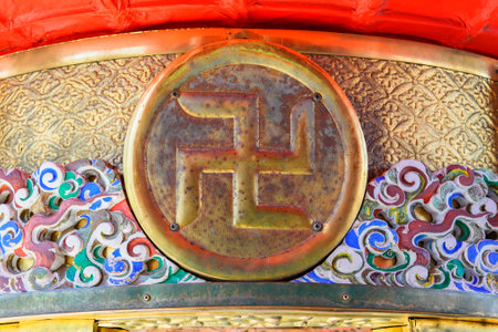tokyo, japan - april 04 2020: Close-up on japanese manji buddhist swastika or sauwastika engraved on the golden metal rim of Kaminarimon or Thunder gate paper lantern in the Asakusa SensÅ-ji temple.