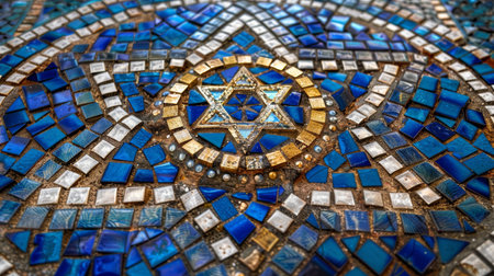 Decorative mosaic Jewish religion symbol star of David, blue white and gold colors. Rosh Hashanah, Jewish New Year holiday or Hannukah greeting card concept. Generative ai.